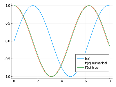 plot!(x[1 :end-1 ], dfdx, label = "f'(x) numerical" )