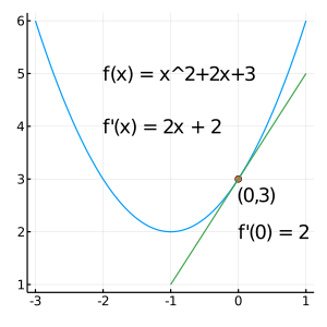 \[ 傾き = \frac{\Delta y}{\Delta x}=f^\prime(x) = 2x + 2\]