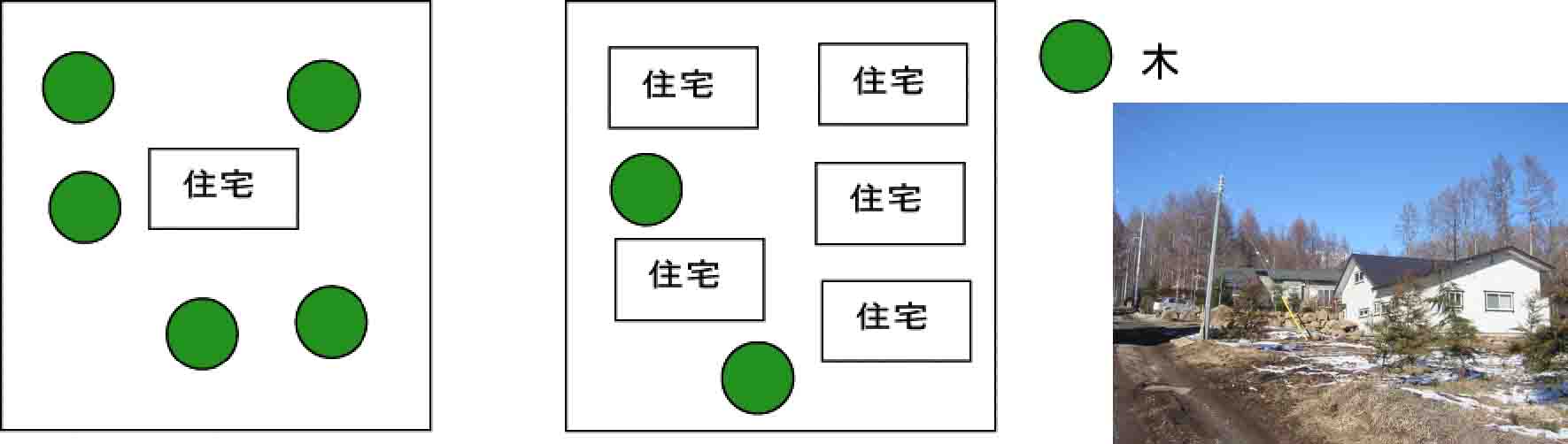 また、林地内は一般的には宅地が目立ちにくいが林地内の一区画を開発する場合、敷地面積が大きいと宅地は目立たないが同じ区画に多くの宅地化が起こると戸々の敷地面積が小さくなり林地が少なくなることで景観的問題となってしまう。
