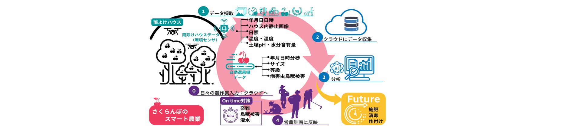 サクランボの⽣産現場では、⾼収益作物であるにもかかわらず、⾼齢化や熟練労働者の不⾜、⻑時間労働により、⽣産者の減少と収益の伸び悩みが続いている。これらの課題を解決するため収穫後に最も⼿間のかかる選果およびパック詰め作業を⾃動化する世界初の⾃動選果・パック詰めシステムを開発した。 さらに、選果データと環境・営農データを組み合わせたデータサービスを提供し、内外の市場に⼤きなインパクトを与える事業モデルを構築する。
