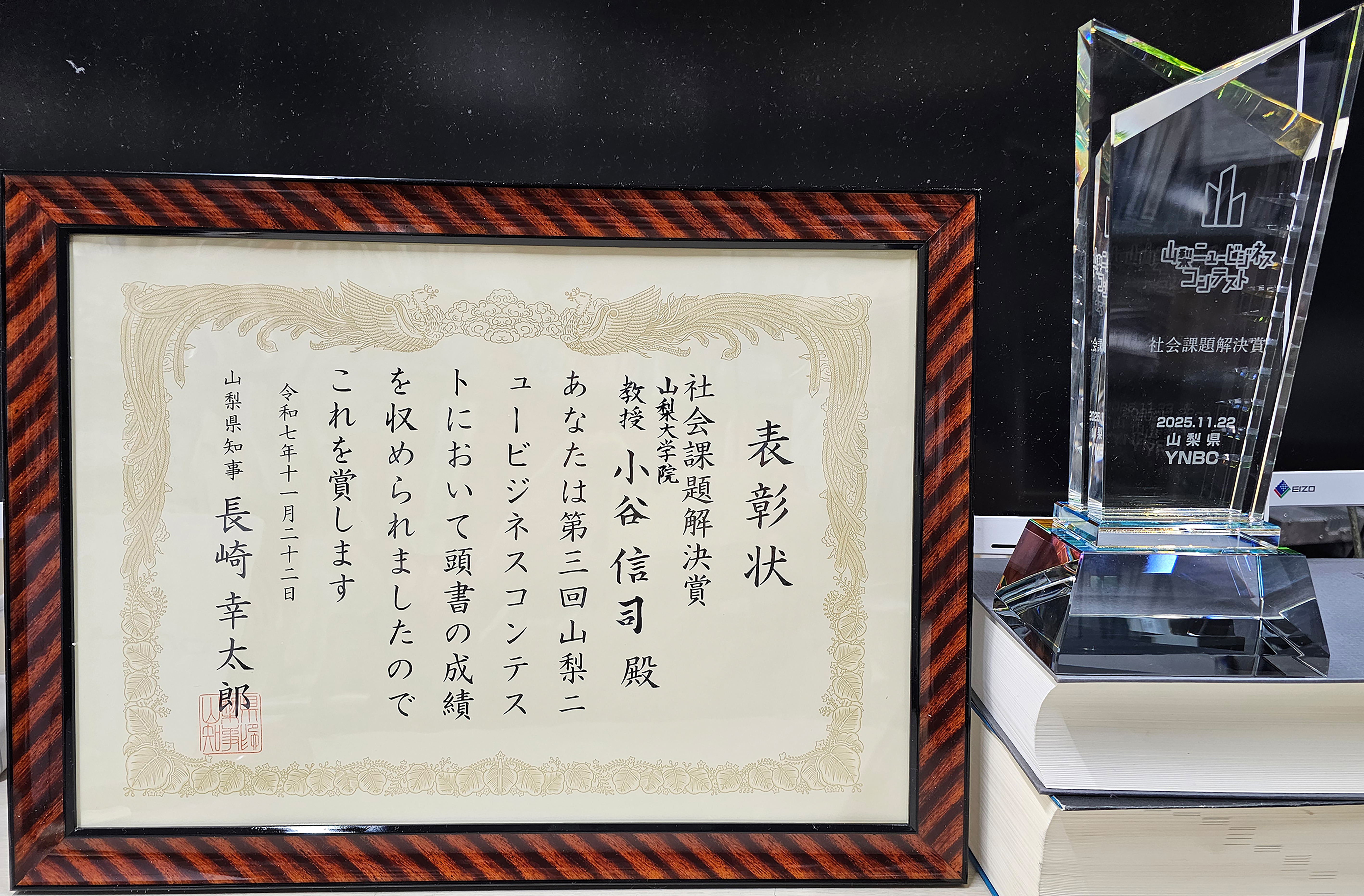 山梨ニュービジネスコンテスト [1] が下記で行われました。小谷教授は、発表5組目で、見事に「社会課題解決賞」に選ばれました。