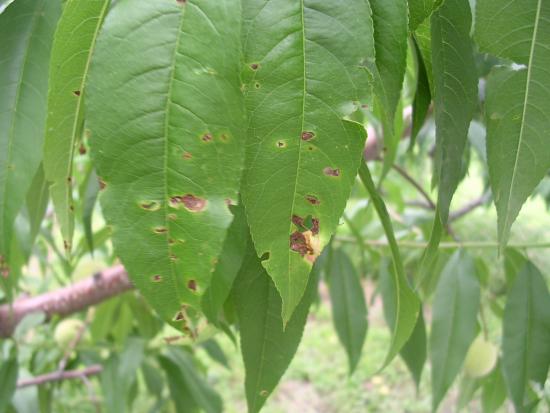 感染した葉はたくさんの穴が開き、落葉が多くなると収穫できるモモの数が減る