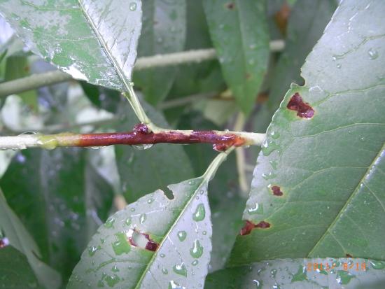 モモのせん孔細菌病は、上の画像のように葉や枝、果実に細菌が侵入することでモモ樹木の成長に大きな影響を及ぼす。