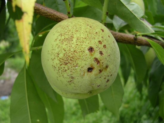 果実に感染すると褐色の点々がでて、ひどくなると穴が開き商品価値がなくなる