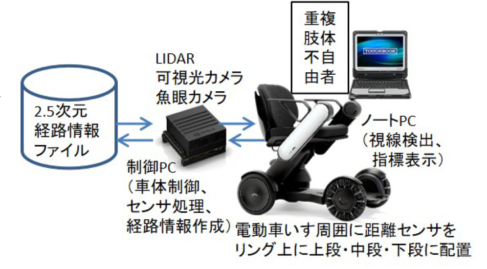 次に、本人の視線を用いて、速度コントロール可能で自由に経路を選択できる移動方法を実現し、センサ情報や制御による「絶対にぶつからない」移動支援ロボットを研究開発する。